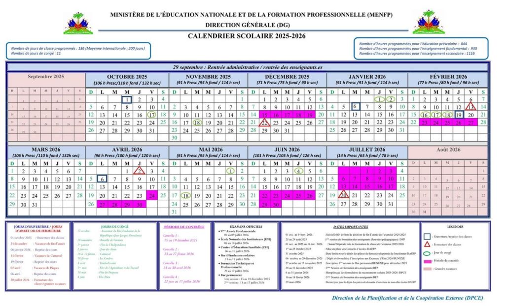Le Ministère de l’Éducation Nationale et de la Formation Professionnelle (MENFP) a l’avantage d’informer le public, en général, et la communauté éducative, en particulier, que la rentrée scolaire pour l’année académique 2025-2026 est fixée au mercredi 1er octobre 2025.