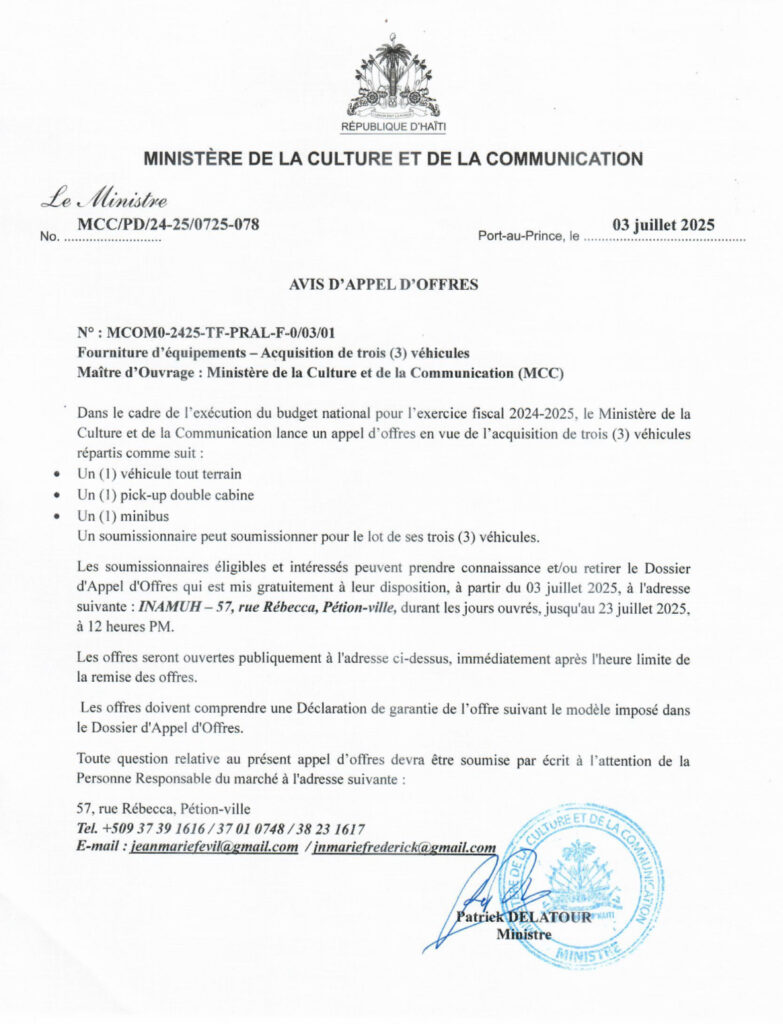 Dans le cadre de l’exécution du budget national pour l’exercice fiscal 2024-2025, le Ministère de la Culture et de la Communication lance un appel d’offres en vue de l’acquisition de trois (3) véhicules répartis comme suit :